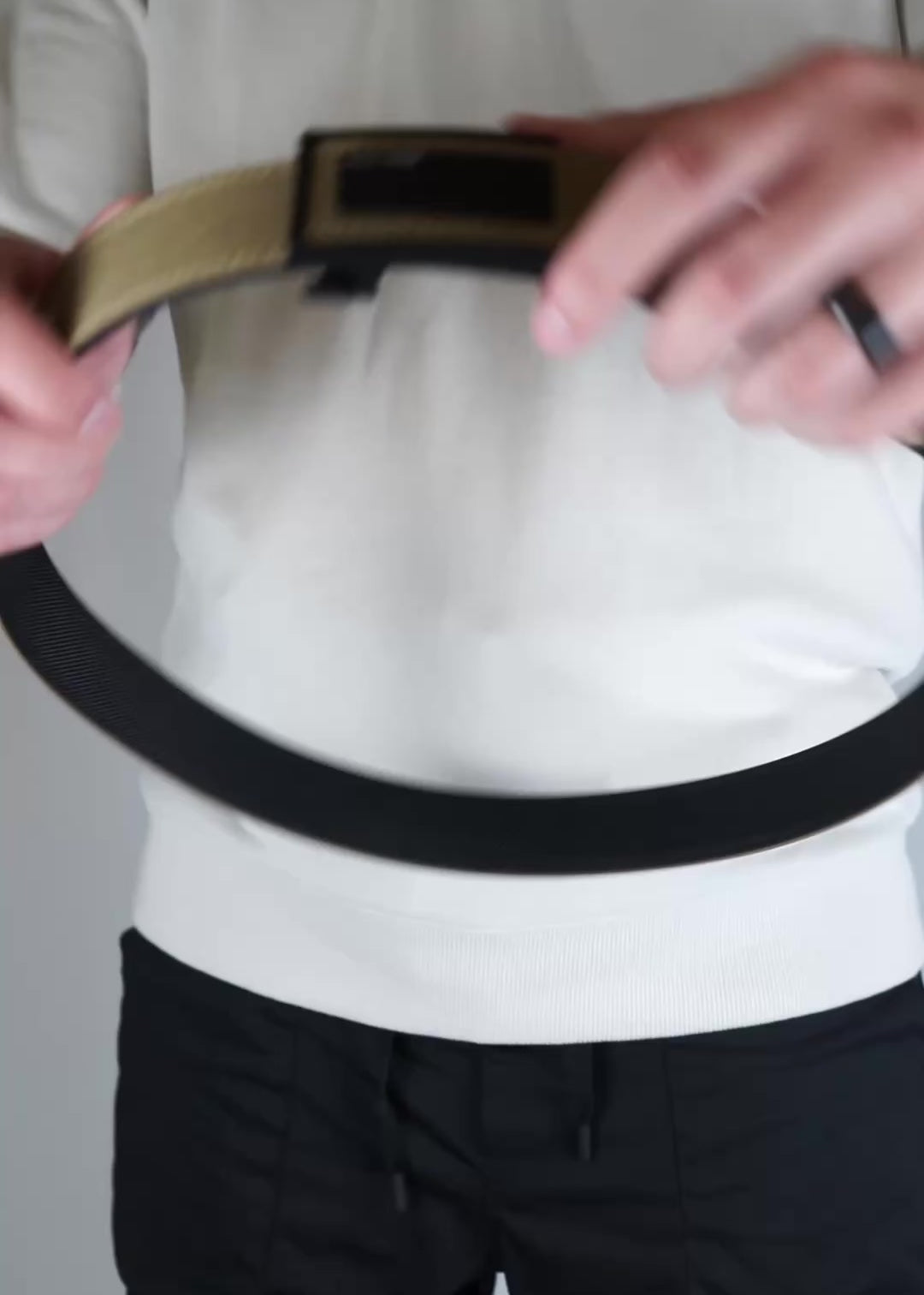 The only belt with interior belt threading that runs the excess material on the inside instead of having to fish it through the other belt loops